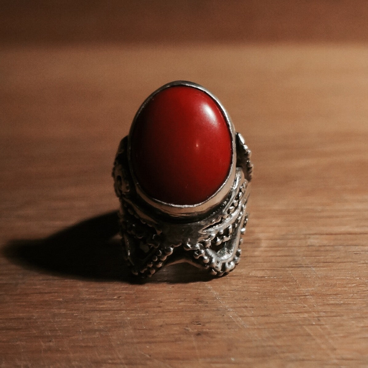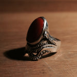 This ring is set with a blood red oval of coral.